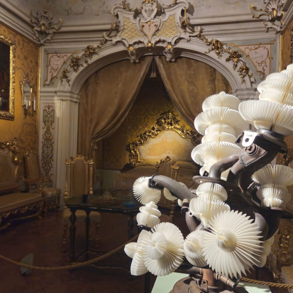 Le sculture dell’artista giapponese Keita Miyazaki si insinuano tra gli arredi della storica dimora imolese, dando vita a un giardino immaginario dove forme, colori e materiali dialogano con l’eleganza del passato. Un incontro suggestivo tra memoria e modernità.